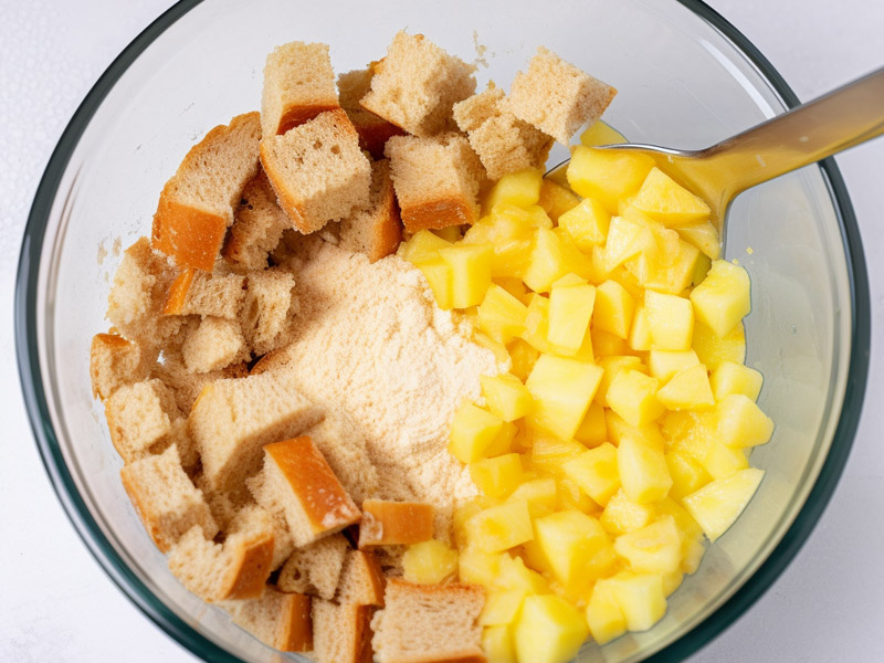 2) In a large mixing bowl, combine the bread cubes and crushed pineapple.