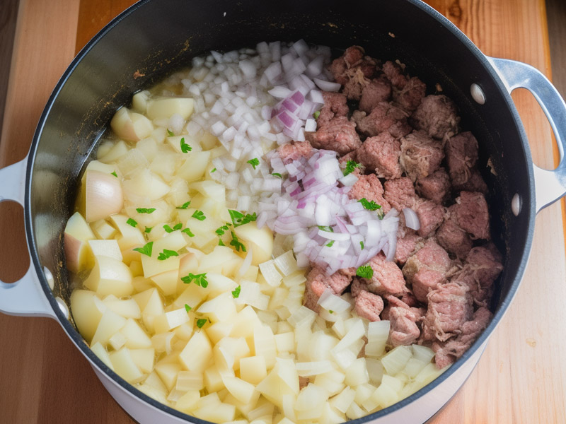 2) Add the chopped onion and minced garlic to the pot with the meat. Sauté for a few minutes until the onions are soft.